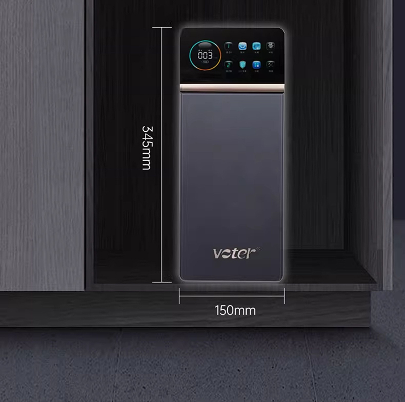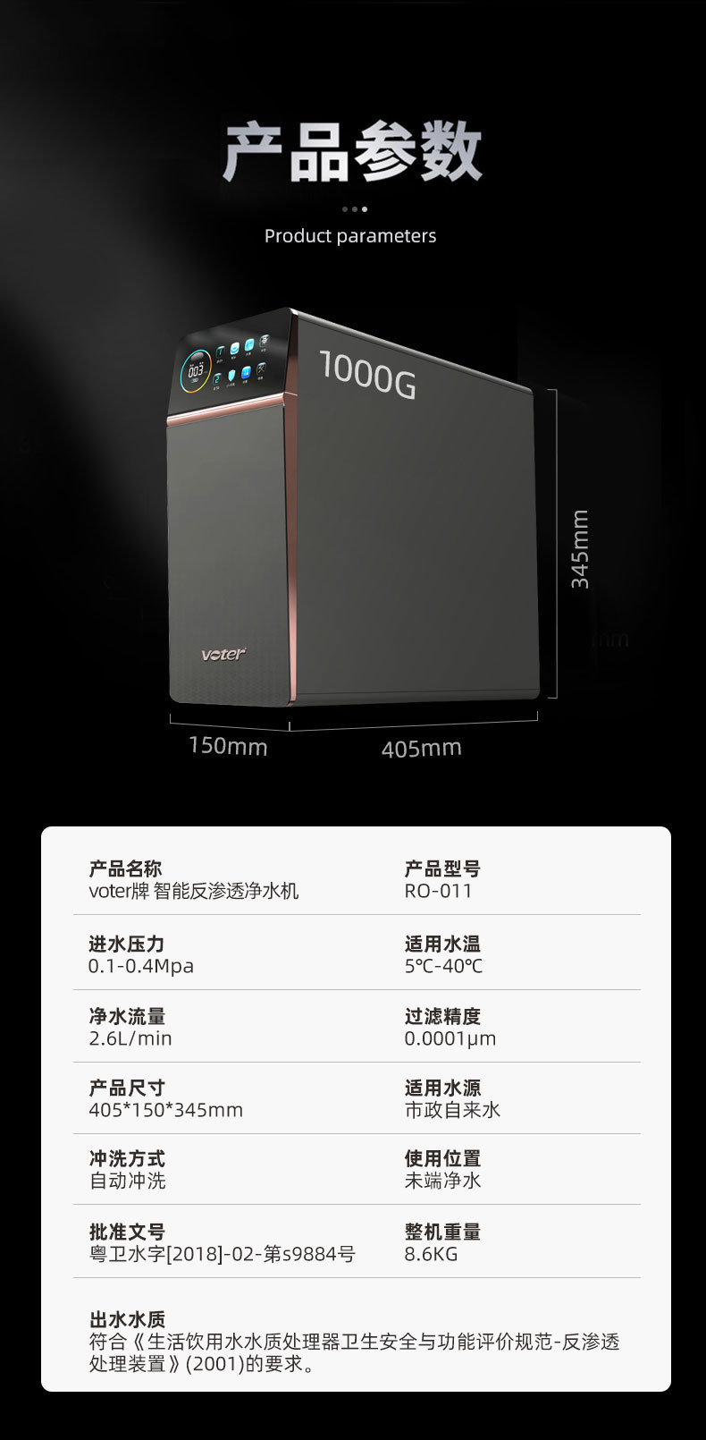 1. Three core four stage RO reverse osmosis purification system, direct drinking water for mother and baby. 2. Filter combination: high flow composite filter+RO reverse osmosis membrane+post activated carbon 3. Integrated waterway design with dual leak prevention and 3-second self core replacement. 4. Kitchen and drinking dual outlet, no water storage tank design, saving space. 5. High quality RO membrane, 800G high flow rate, water production of 2.08L/min. 6. The wastewater ratio is 2:1, with a water production rate of 70%, which is better than the national first-class water efficiency. 7. New 5-chamber shock absorber pump with upgraded low-noise design. 8. Smart digital display screen, TDS value display, filter life reminder, one click reset.